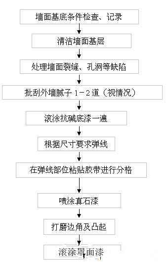 “三分涂料 七分施工”,建筑涂料質(zhì)量的優(yōu)劣,除了與涂料本身質(zhì)量的好壞有關(guān),還與施工技術(shù)水平有很大關(guān)系。為了保證建筑外墻涂料真石漆的施工質(zhì)量,必須要有正確的施工工藝和正確的施工方法,并要求施工人員嚴格按工藝要求進行施工。